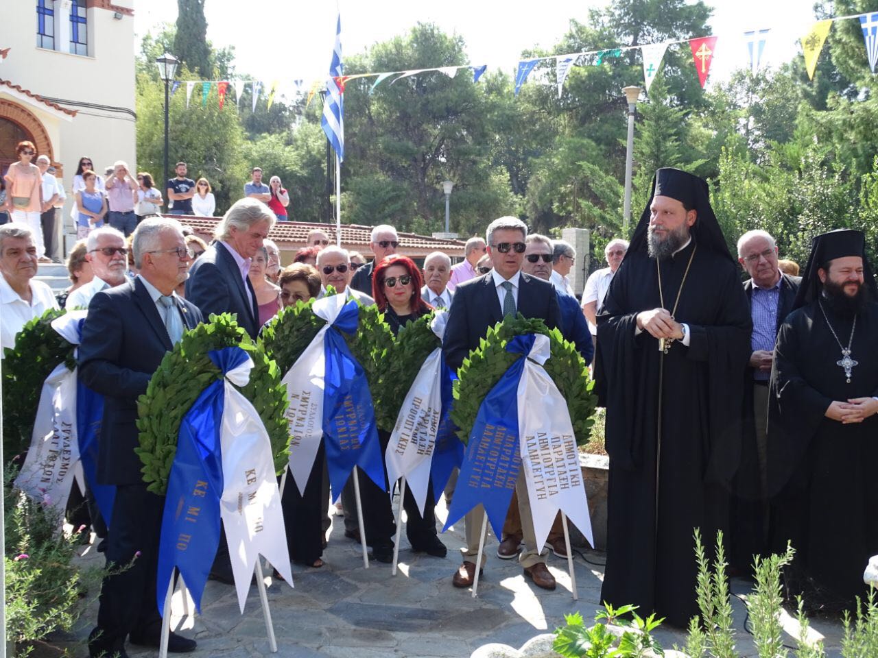 Ακολούθως, πραγματοποιήθηκε κατάθεση στεφάνων, ενώπιον του ανδριάντα του μακαριστού Μητροπολίτου Πατάρων Μελετίου στον περίβολο του Ιερού Ναού, όπου τηρήθηκε ενός λεπτού σιγή και ψάλθηκε ο Εθνικός Ύμνος.