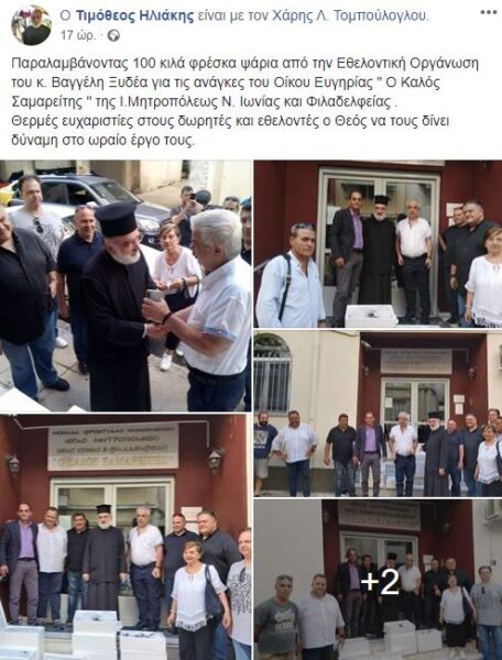 “Παραλαμβάνοντας 100 κιλά φρέσκα ψάρια από την Εθελοντική Οργάνωση του κ. Βαγγέλη Ξυδέα για τις ανάγκες του Οίκου Ευγηρίας “Ο Καλός Σαμαρείτης” της Ι.Μητροπόλεως Ν. Ιωνίας και Φιλαδελφείας. Θερμές ευχαριστίες στους δωρητές και εθελοντές ο Θεός να τους δίνει δύναμη στο ωραίο έργο τους” γράφει ο π. Τιμόθεος Ηλιάκης σε επίκαιρη ανάρτησή του.