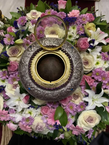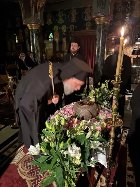 Η Αγρυπνία τελέσθηκε ενώπιον της Τιμίας Κάρας του Αγίου Γρηγορίου Νύσσης, η οποία φυλάσσεται, ως πολύτιμο θησαύρισμα στον Ιερό Ναό του Αγίου Ευσταθίου, και η οποία τέθηκε σε προσκύνηση προς ευλογία και αγιασμό του πιστού λαού.
