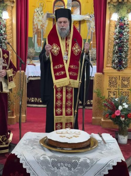 Μετά το πέρας της Δοξολογίας ο Σεβασμιώτατος ευλόγησε την Πρωτοχρονιάτικη Αγιοβασιλόπιτα και ευχήθηκε το νέο Έτος να είναι ειρηνικό και καρποφόρο για όλο τον κόσμο.
