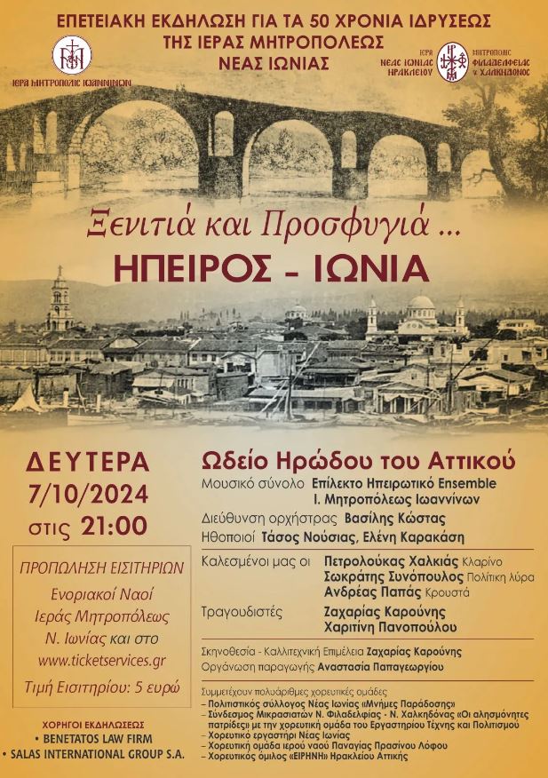 Στο πλαίσιο των εορταστικών εκδηλώσεων για την συμπλήρωση 50 ετών από την ίδρυσή της (1974-2024), η Ιερά Μητρόπολη Νέας Ιωνίας, Φιλαδελφείας, Ηρακλείου και Χαλκηδόνος διοργανώνει, σε συνεργασία με την Ιερά Μητρόπολη Ιωαννίνων, επετειακή μουσικοχορευτική παράσταση, η οποία θα πραγματοποιηθεί την Δευτέρα 7 Οκτωβρίου 2024 στο Ωδείο Ηρώδου του Αττικού, με τίτλο: «Ξενιτιά και Προσφυγιά… ΗΠΕΙΡΟΣ – ΙΩΝΙΑ», σε σκηνοθετική και καλλιτεχνική επιμέλεια του Ζαχαρία Καρούνη.
