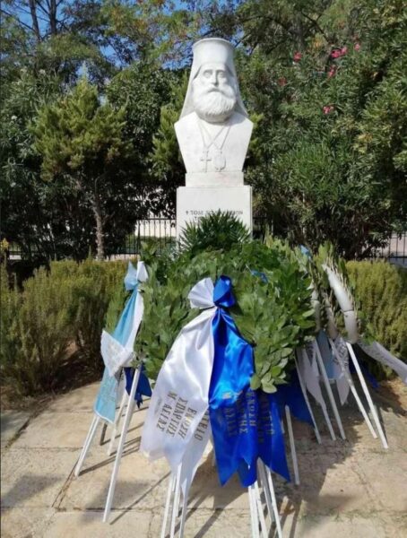 Ακολούθως, πραγματοποιήθηκε κατάθεση στεφάνων ενώπιον του ανδριάντα του μακαριστού Μητροπολίτου Πατάρων Μελετίου στον περίβολο του Ιερού Ναού, όπου τηρήθηκε ενός λεπτού σιγή και εψάλη ο Εθνικός Ύμνος.