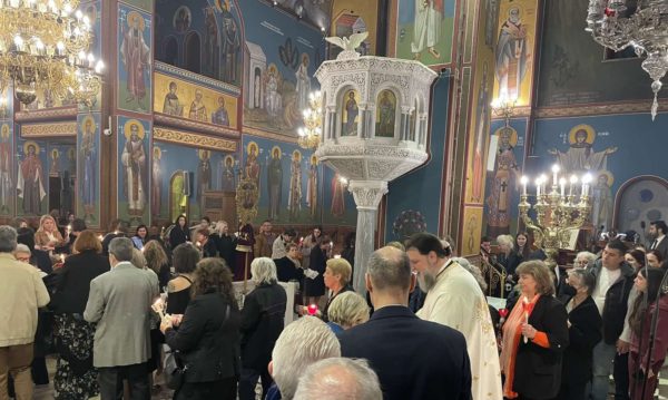 Πλήθος πιστών προσήλθαν με κατάνυξη στον Μητροπολιτικό Ναό, και κρατώντας αναμμένες λαμπάδες από το ανέσπερο φως, συγκεντρώθηκαν στον προαύλιο χώρο του Ναού για να ακούσουν τον νικητήριο παιάνα της Εκκλησίας «Χριστός Ανέστη», που σηματοδοτεί τον θρίαμβο της δόξης του Θεού και της νίκη της ζωής κατά του θανάτου.