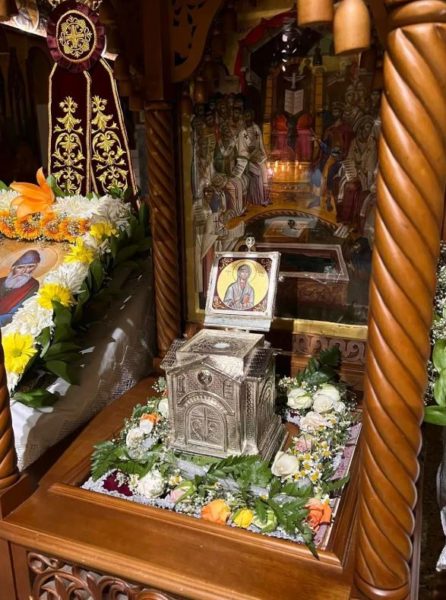 Νωρίτερα, στο πλαίσιο του εορτασμού, ο Σεβασμιώτατος Μητροπολίτης κ. Μακάριος, παρουσία του ιερού κλήρου, υποδέχθηκε το Ιερό Λείψανο της Αγίας Ισαποστόλου Ελένης, το οποίο τέθηκε στο μέσο το Ναού προς ευλογία και αγιασμό του πιστού λαού.