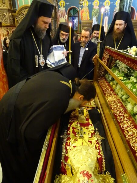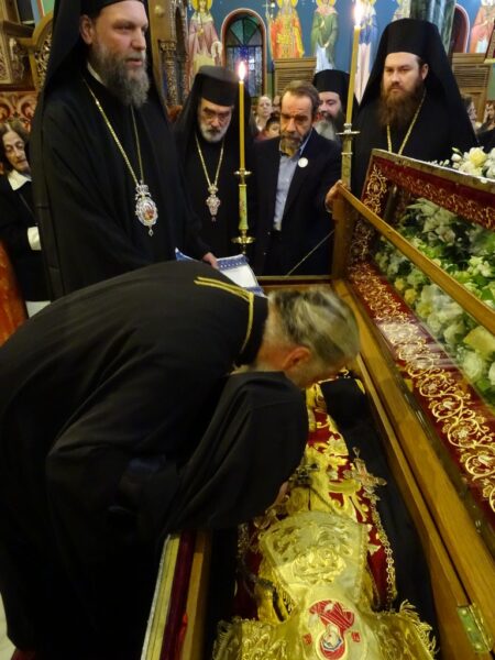 Ο κ. Ιερώνυμος, αφού αρχικά ευχαρίστησε τον κ. Γαβριήλ για την ευγενή πρόσκληση, στη συνέχεια αναφέρθηκε στο θαυμαστό μαρτυρικό βίο του Πολιούχου της Ιεράς Μητροπόλεως Αγίου Γεωργίου του Νεαπολίτου, το άφθαρτο Ιερό Σκήνωμά του οποίου φανερώνει την ζωντανή παρουσία του Θεού και στα χαρακτηριστικά του δικαίου ανθρώπου, ευχόμενος προς όλους κάθε δωρεά από τον Πανάγαθο Θεό διά πρεσβειών του Προστάτου και Πολιούχου Αγίου Γεωργίου του Νεαπολίτου.