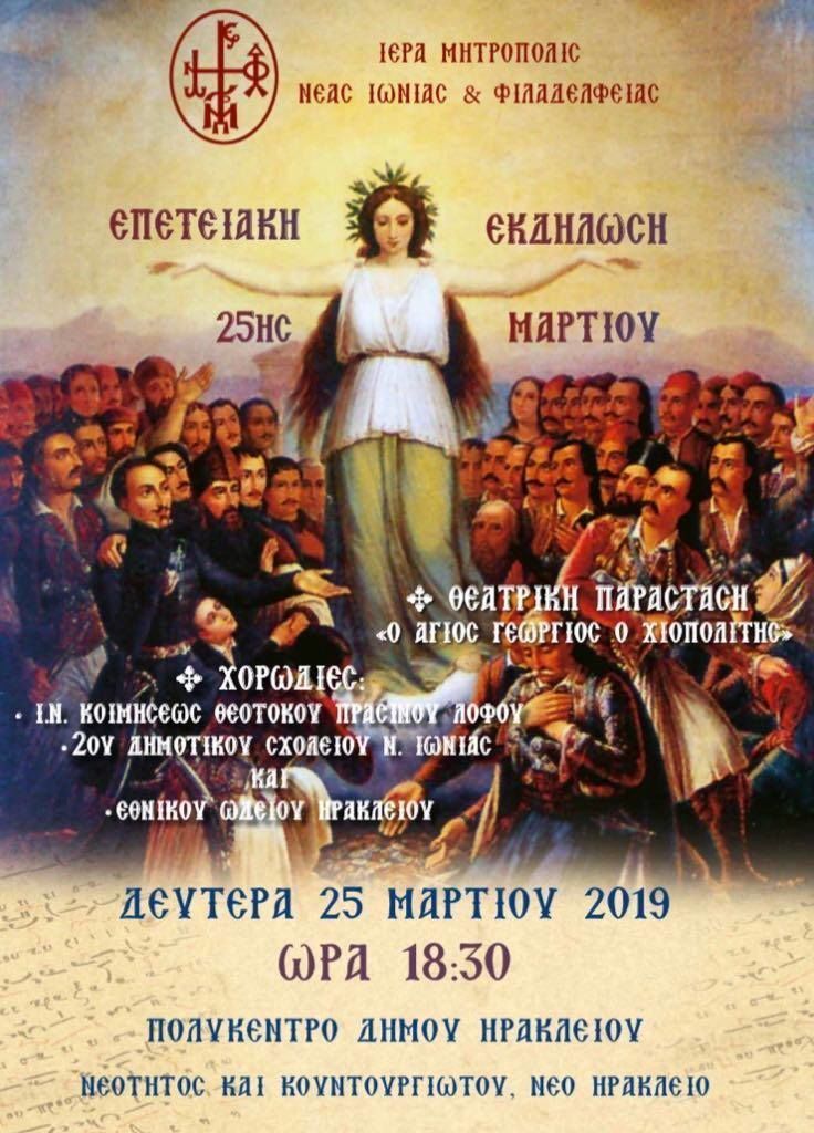 Με την ευκαιρία της μεγάλης εορτής του Ευαγγελισμού της Θεοτόκου και της εθνικής παλιγγενεσίας η Ιερά Μητρόπολη Νέας Ιωνίας και Φιλαδελφείας σας προσκαλεί στην εορταστική εκδήλωση που διοργανώνει τη Δευτέρα 25 Μαρτίου 2019 και ώρα 6.30μ.μ. στο Πολύκεντρο του Δήμου Ηρακλείου Αττικής (Κουντουργιώτου 18 & Νεότητος, Ν. Ηράκλειο).