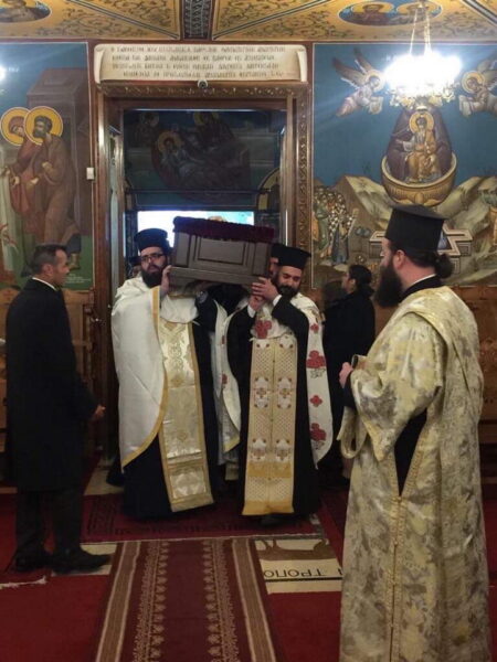 Το σεπτό σκήνωμα υποδέχθηκε αρχικά στο Επισκοπείο της Ιεράς Μητροπόλεως στη Ν. Ιωνία ο Σεβασμιώτατος Μητροπολίτης κ. Γαβριήλ με κληρικούς της Ιεράς Μητροπόλεως, ο οποίος και τέλεσε τρισάγιο.