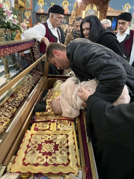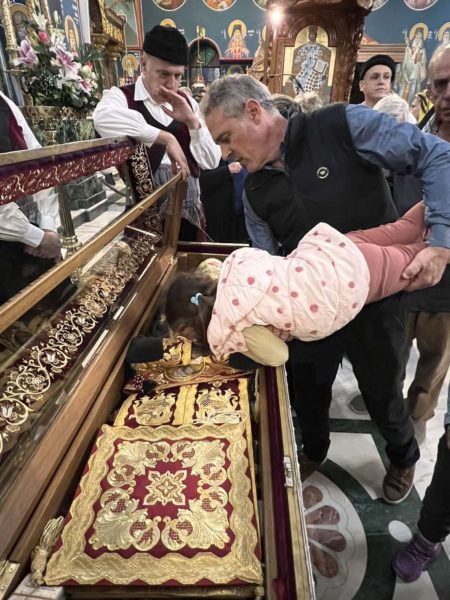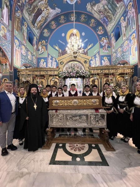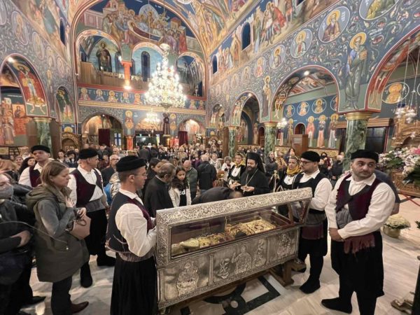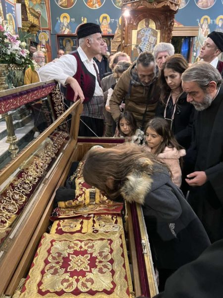 Στη συνέχεια, εψάλη Ιερά Παράκληση προς τον Άγιο Γεώργιο τον Νεαπολίτη και πραγματοποιήθηκε προσκύνηση του Ιερού Λειψάνου του, καθώς και διανομή επετειακών εικόνων για τα 100 έτη από την έλευση του Ιερού Σκηνώματος, με ιερά άμφια του Αγίου προς ευλογία του πιστού λαού.