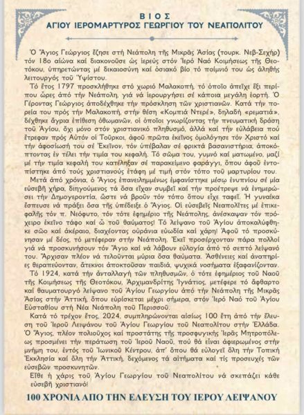 Εορτή Αγίου Γεωργίου του Νεαπολίτου, Πολιούχου Ι.Μ. Νέας Ιωνίας – 100 χρόνια από την έλευση του Ιερού Σκηνώματος