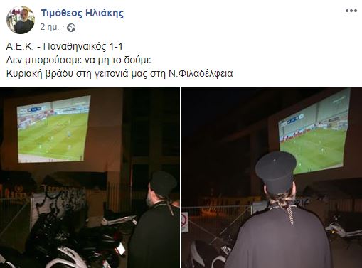 “Α.Ε.Κ. – Παναθηναϊκός 1-1. Δεν μπορούσαμε να μη το δούμε. Κυριακή βράδυ στη γειτονιά μας στη Ν. Φιλαδέλφεια” αναφέρει ο π. Τιμόθεος Ηλιάκης σε πρόσφατη ανάρτησή του.