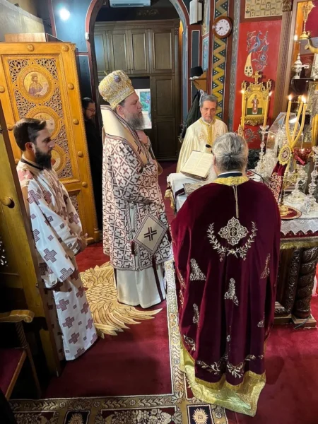 Κατά την Θεία Λειτουργία τον Σεβασμιώτατο πλαισίωσαν οι εφημέριοι του Ιερού Ναού, ενώ εντός του Ιερού Βήματος παρέστησαν συμπροσευχόμενοι ο Σεβασμιώτατος Μητροπολίτης Ανέων κ. Μακάριος και ο Επίσκοπος Κεράμων κ. Βαρθολομαίος.