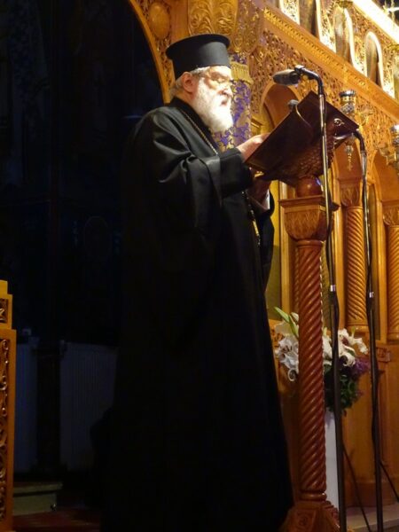 Μετά το πέρας του Εσπερινού. ο Αιδεσιμολογιώτατος Πρωτοπρ. Θωμάς Συνοδινός, Πρωθιερέας του Ιερού Καθεδρικού Ναού Αθηνών ανέπτυξε ομιλία με θέμα: «Ο Μάρτυρας Πατριάρχης Άγιος Γρηγόριος ο Ε’».