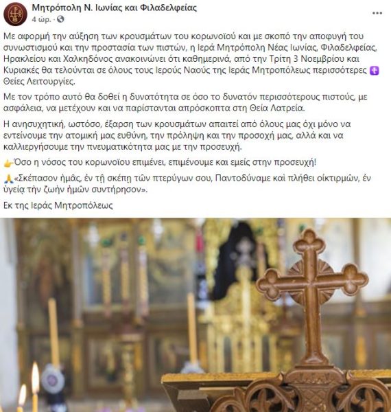 Με αφορμή την αύξηση των κρουσμάτων του κορωνοϊού και με σκοπό την αποφυγή του συνωστισμού και την προστασία των πιστών, η Ιερά Μητρόπολη Νέας Ιωνίας, Φιλαδελφείας, Ηρακλείου και Χαλκηδόνος ανακοινώνει ότι καθημερινά, από την Τρίτη 3 Νοεμβρίου και Κυριακές θα τελούνται σε όλους τους Ιερούς Ναούς της Ιεράς Μητροπόλεως περισσότερες Θείες Λειτουργίες.