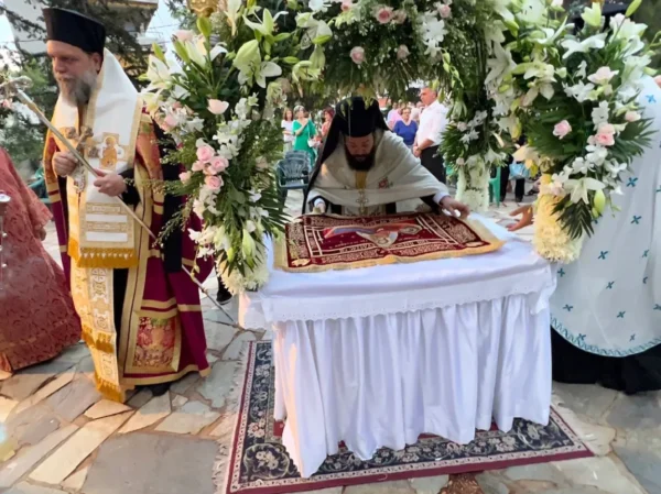 Του Πανηγυρικού Εσπερινού χοροστάτησε ο Σεβασμιώτατος Μητροπολίτης Νέας Ιωνίας, Φιλαδελφείας, Ηρακλείου και Χαλκηδόνος κ. Γαβριήλ, ο οποίος στη συνέχεια, συμπαραστατούμενος από κληρικούς της Ιεράς Μητροπόλεως, έψαλε τα Εγκώμια της Θεοτόκου ενώπιον του Επιταφίου της.