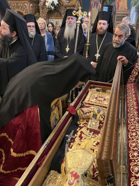 Νωρίτερα, στο πλαίσιο του εορτασμού του Πολιούχου της Ιεράς Μητροπόλεως, πραγματοποιήθηκε στα προπύλαια του Ιερού Ναού λαμπρή υποδοχή τεμαχίου Τιμίου Ξύλου, το οποίο στη συνέχεια τέθηκε σε προσκύνηση προς ευλογία και αγιασμό του πιστού λαού.