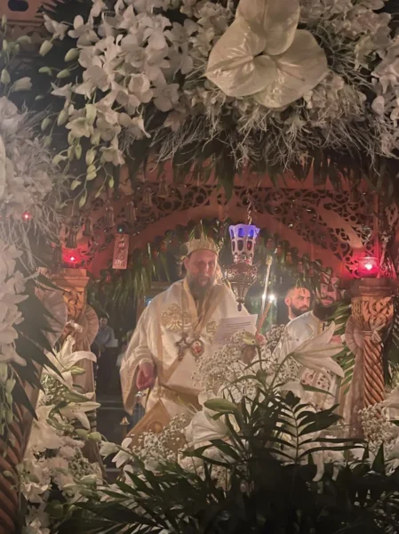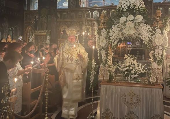 Ο Σεβασμιώτατος χοροστάτησε στην ακολουθία του Όρθρου, του Επιταφίου Θρήνου και των Εγκωμίων προς την Υπεραγία Θεοτόκο και στη συνέχεια τέλεσε την Αρχιερατική Θεία Λειτουργία πλαισιωμένος από κληρικούς της Ιεράς Μητροπόλεως.