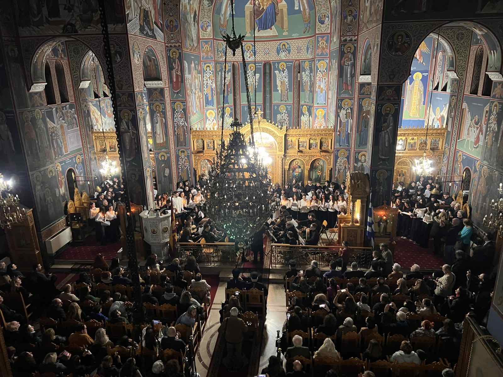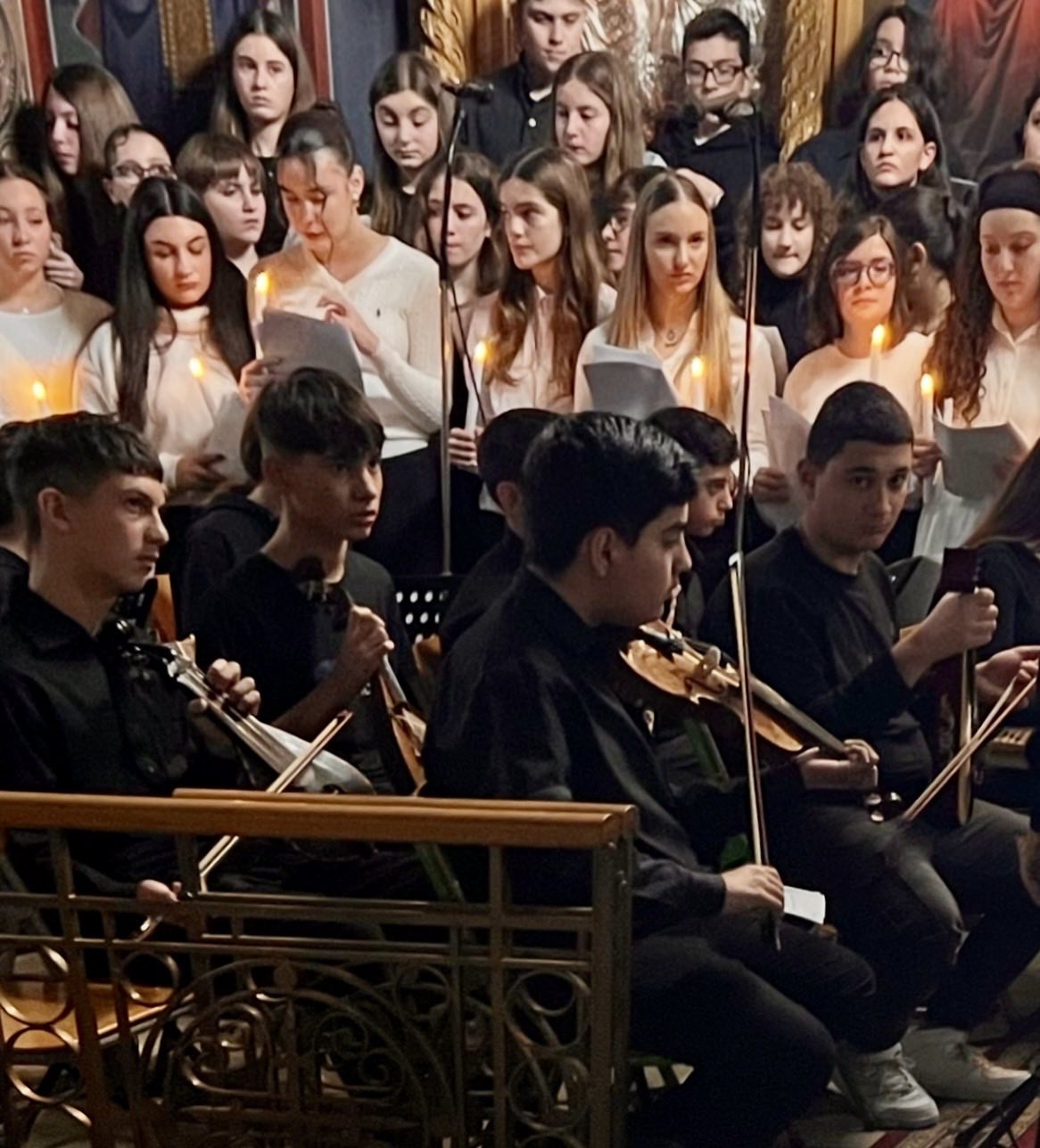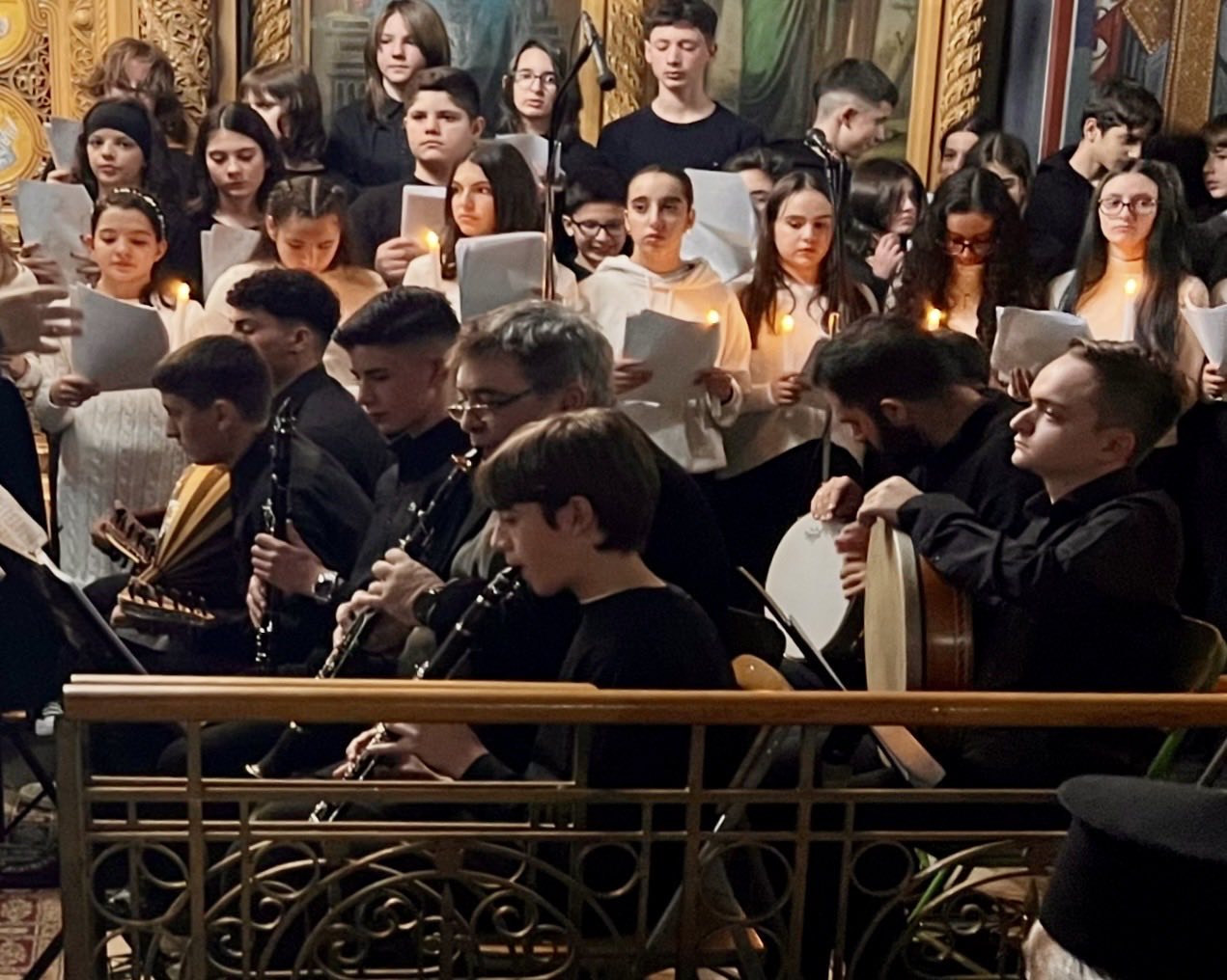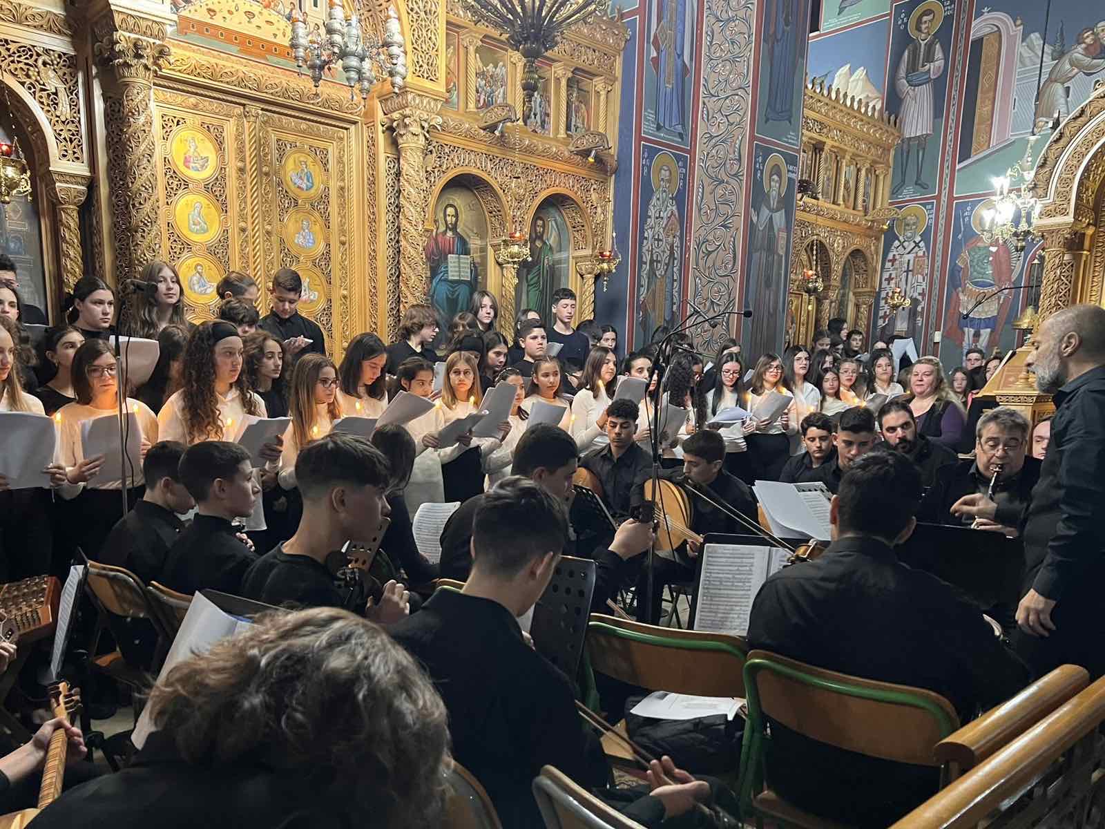Στη συνέχεια, μεγάλος αριθμός μαθητών των μουσικών και χορωδιακών συνόλων Ελληνικής, Βυζαντινής και Ανατολικής Μουσικής, καθώς και Ρωμιών Συνθετών της Πόλης του Μουσικού Σχολείου Ιλίου, απέδωσε με ενάργεια εκκλησιαστικούς ύμνους του Αγίου Δωδεκαημέρου και ερμήνευσε θαυμάσια χριστουγεννιάτικα κάλαντα, παινέματα, παραδοσιακά τραγούδια και σκοπούς από κάθε γωνιά της πατρίδας μας, δημιουργώντας κλίμα πνευματικής χαράς, εισάγοντας τους παρισταμένους στο βαθύτερο νόημα της εορτής της Γεννήσεως του Χριστού.