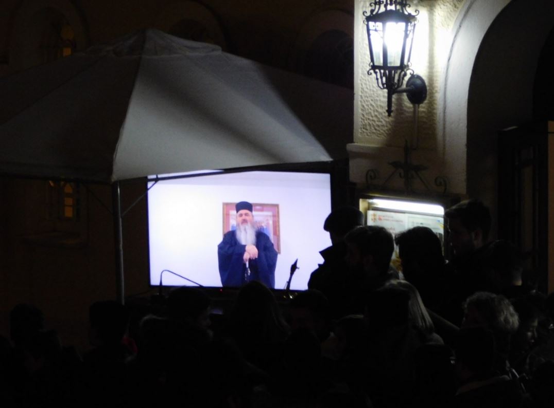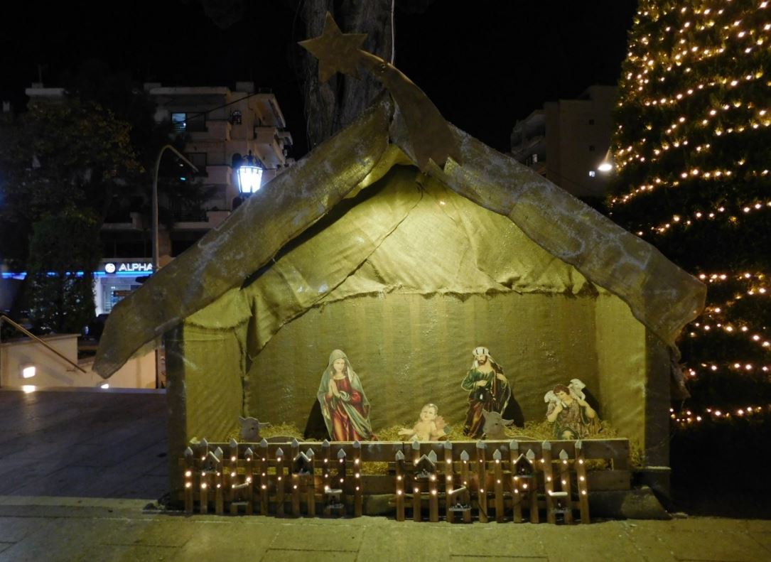 Αμέσως μετά, με το σύνθημα του Σεβασμιωτάτου, άναψε το μεγάλο Χριστουγεννιάτικο δέντρο, φωταγωγήθηκαν τα στολισμένα δέντρα του αύλειου χώρου και η Φάτνη.