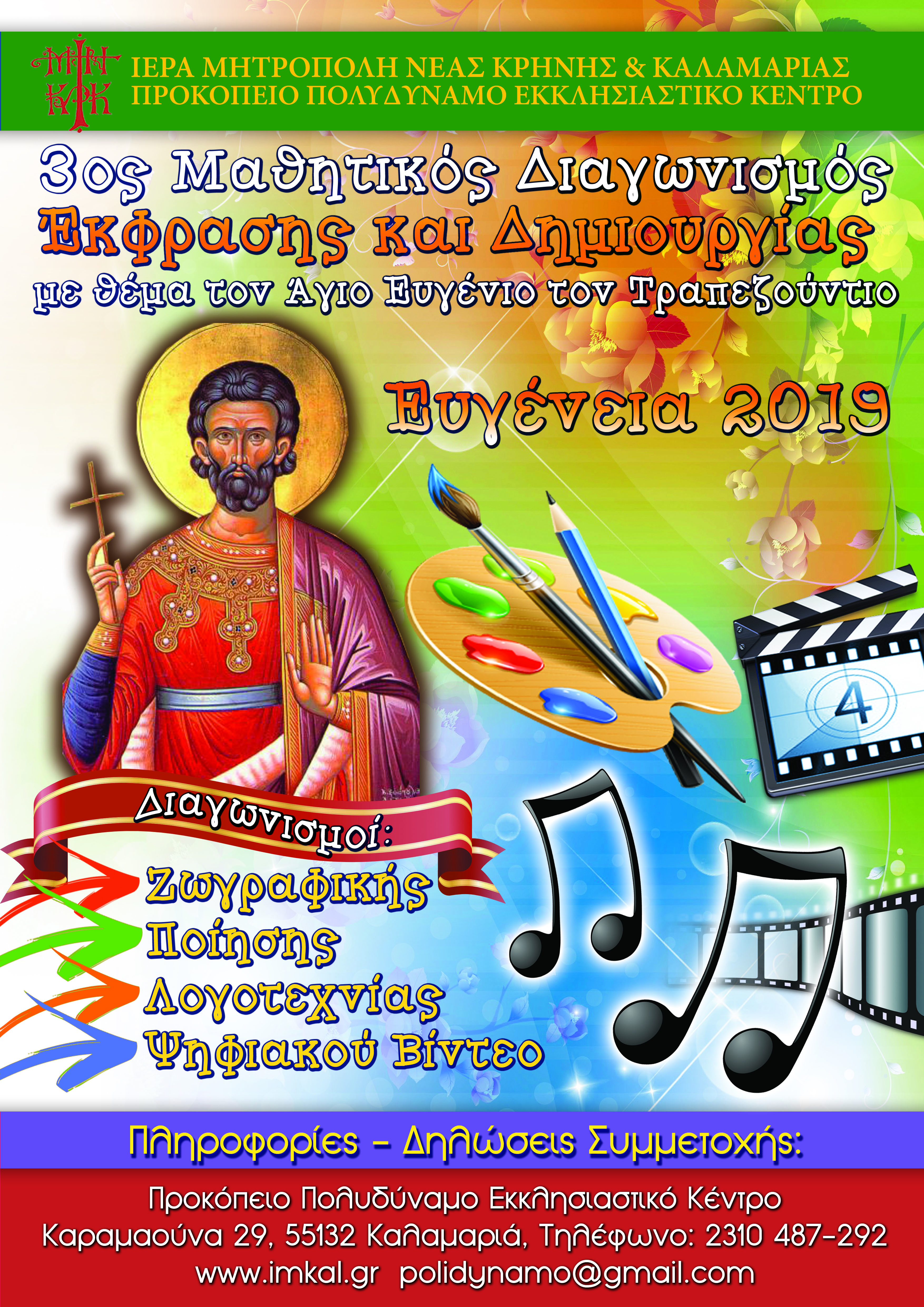 Η Ιερά Μητρόπολη Νέας Κρήνης και Καλαμαριάς διοργανώνει τον 3ο μαθητικό διαγωνισμό έκφρασης και δημιουργίας με θέμα τον Άγιος Ευγένιο τον Τραπεζούντιο. Τα παιδιά καλούνται να διαγωνιστούν σε θέματα ζωγραφικής, λογοτεχνίας, ποίησης και ψηφιακών βίντεο.