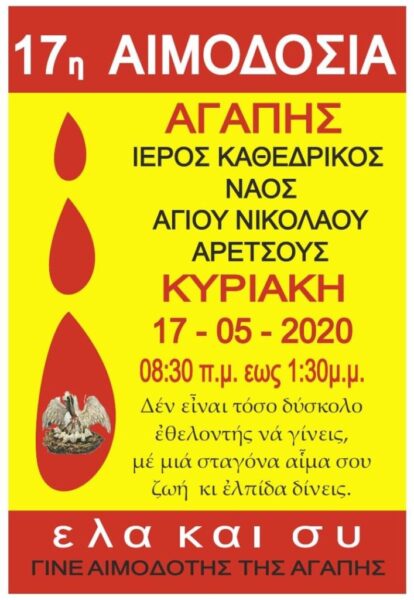 Στον Ιερό Καθεδρικό Ναό Αγίου Νικολάου στη Καλαμαριά διοργανώνεται αύριο η 17η αιμοδοσία αγάπης. Στη σχετική αφίσα υπάρχει το μήνυμα “Έλα και συ γίνε αιμοδότης αγάπης”, ενώ με ένα μικρό τετράστιχο προσπαθεί η Ιερά Μητρόπολη Νέας Κρήνης και Καλαμαριάς να δώσει κίνητρο στον κόσμο να συμμετέχει.