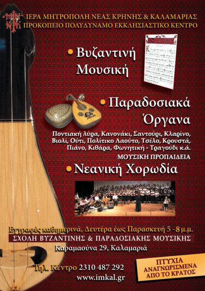 Από το Προκόπειο Πολυδύναμο Εκκλησιαστικό Κέντρο της Ιεράς Μητροπόλεως Νέας Κρήνης και Καλαμαριάς ανακοινώνεται ότι συνεχίζονται κανονικά εξ αποστάσεως μέσα από διαδικτυακή πλατφόρμα όλα τα μαθήματα της Αναγνωρισμένης από το Κράτος Σχολής Βυζαντινής Μουσικής και & Παραδοσιακών Οργάνων.