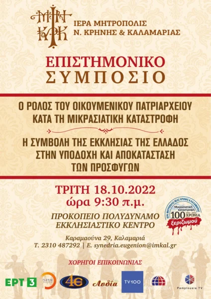 Επιστημονικό Συμπόσιο με γενικό τίτλο «Ο ρόλος του Οικουμενικού Πατριαρχείου κατά τη Μικρασιατική Καταστροφή – Η Συμβολή της Εκκλησίας της Ελλάδος στην υποδοχή και αποκατάσταση των προσφύγων», διοργανώνει η Ιερά Μητρόπολη Νέας Κρήνης και Καλαμαριάς, αύριο Τρίτη 18 Οκτωβρίου στις 10:00 π.μ. στο Προκόπειο Πολυδύναμο Εκκλησιαστικό Κέντρο (Καραμαούνα 29).