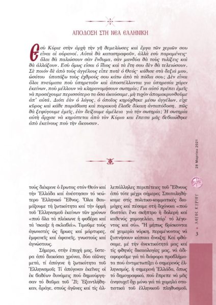 Ακόμα εκφράζει -με αφορμή τη νόσο που ταλαιπωρεί τον πλανήτη, τους προβληματισμούς του σχετικά για τη Δύση που βρίσκεται στη… δύση της και μας παροτρύνει να αφήσουμε τον στείρο πολιτικό ρεαλισμό και να ξαναβρούμε το όραμα, την πίστη και την ελπίδα, για να κάνουμε ένα νέο ’21!