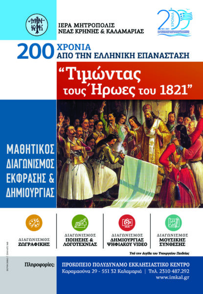 Πανελλήνιο Μαθητικό Διαγωνισμό Έκφρασης & Δημιουργίας, με θέμα «200 χρόνια από την Ελληνική Επανάσταση – Τιμώντας τους Ήρωες του 1821» προκηρύσσει το Προκόπειο Πολυδύναμο Εκκλησιαστικό Κέντρο, με τις ευλογίες του Σεβασμιωτάτου Μητροπολίτου Νέας Κρήνης και Καλαμαριάς.