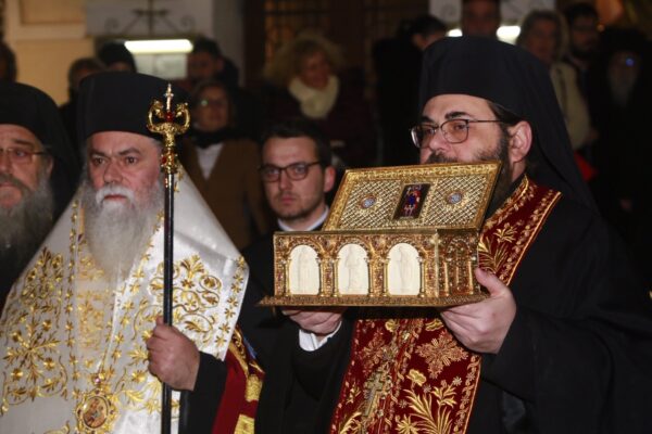 Το Ιερό Λείψανο του Αγίου Βασιλείου προσεκόμισε από την Αίθουσα των Συνεδριών της Διαρκούς Ιεράς Συνόδου της Εκκλησίας της Ελλάδος κατόπιν αιτήσεως του Σεβασμιωτάτου Μητροπολίτου Νέας Κρήνης και Καλαμαριάς κ. Ιουστίνου, ο Πανοσιολογιώτατος Αρχιμ. Δωρόθεος Πάπαρης, Α’ Γραμματέας της Ι.Σ.
