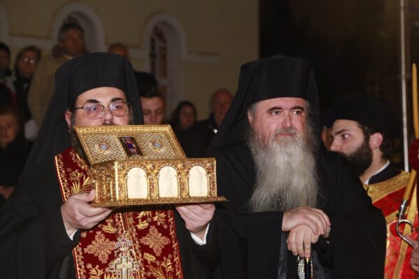 Το Ιερό Λείψανο του Αγίου Βασιλείου προσεκόμισε από την Αίθουσα των Συνεδριών της Διαρκούς Ιεράς Συνόδου της Εκκλησίας της Ελλάδος κατόπιν αιτήσεως του Σεβασμιωτάτου Μητροπολίτου Νέας Κρήνης και Καλαμαριάς κ. Ιουστίνου, ο Πανοσιολογιώτατος Αρχιμ. Δωρόθεος Πάπαρης, Α’ Γραμματέας της Ι.Σ.