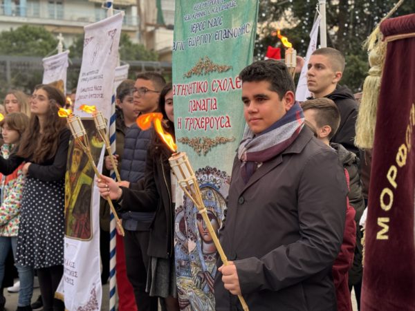 Εν συνεχεία, υπό τον ήχο του τραγουδιού «Σκυτάλη», οι Σεβασμιώτατοι Μητροπολίτες μεταλαμπάδευσαν φλόγα σε 50 δάδες, όσα και τα χρόνια της Μητροπόλεως, τις οποίες κρατούσαν παιδιά των ενοριών.