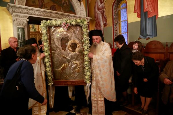 Αμέσως μετά τον πανηγυρικό Εσπερινό πραγματοποιήθηκε η λιτάνευση της Ιεράς Εικόνας προς ευλογία πιστών στη Νέα Μηχανιώνα.