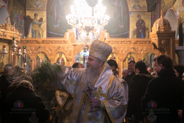 Στο τέλος της Θείας Λειτουργίας τελέσθηκε η Ακολουθία του Μεγάλου Αγιασμού, όπου ο Σεβασμιώτατος αγίασε τα ύδατα και ευλόγησε τους πιστούς με τον Τίμιο Σταυρό.