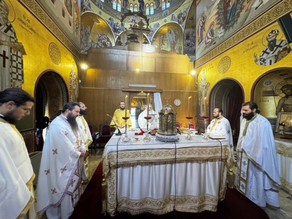 Της Συνάξεως προηγήθηκε Αρχιερατική Θεία Λειτουργία, την οποία ιερούργησε ο Σεβασμιώτατος Ποιμενάρχης κ. Ιουστίνος, στον περικαλλή Ιερό Ναό Παναγίας Φανερωμένης Νέας Μηχανιώνας.
