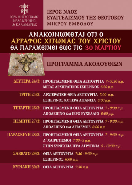 Ο Άρραφος Χιτών θα παραμείνει στον Ιερό Ναό μέχρι και την Κυριακή, 30η Μαρτίου το βράδυ.