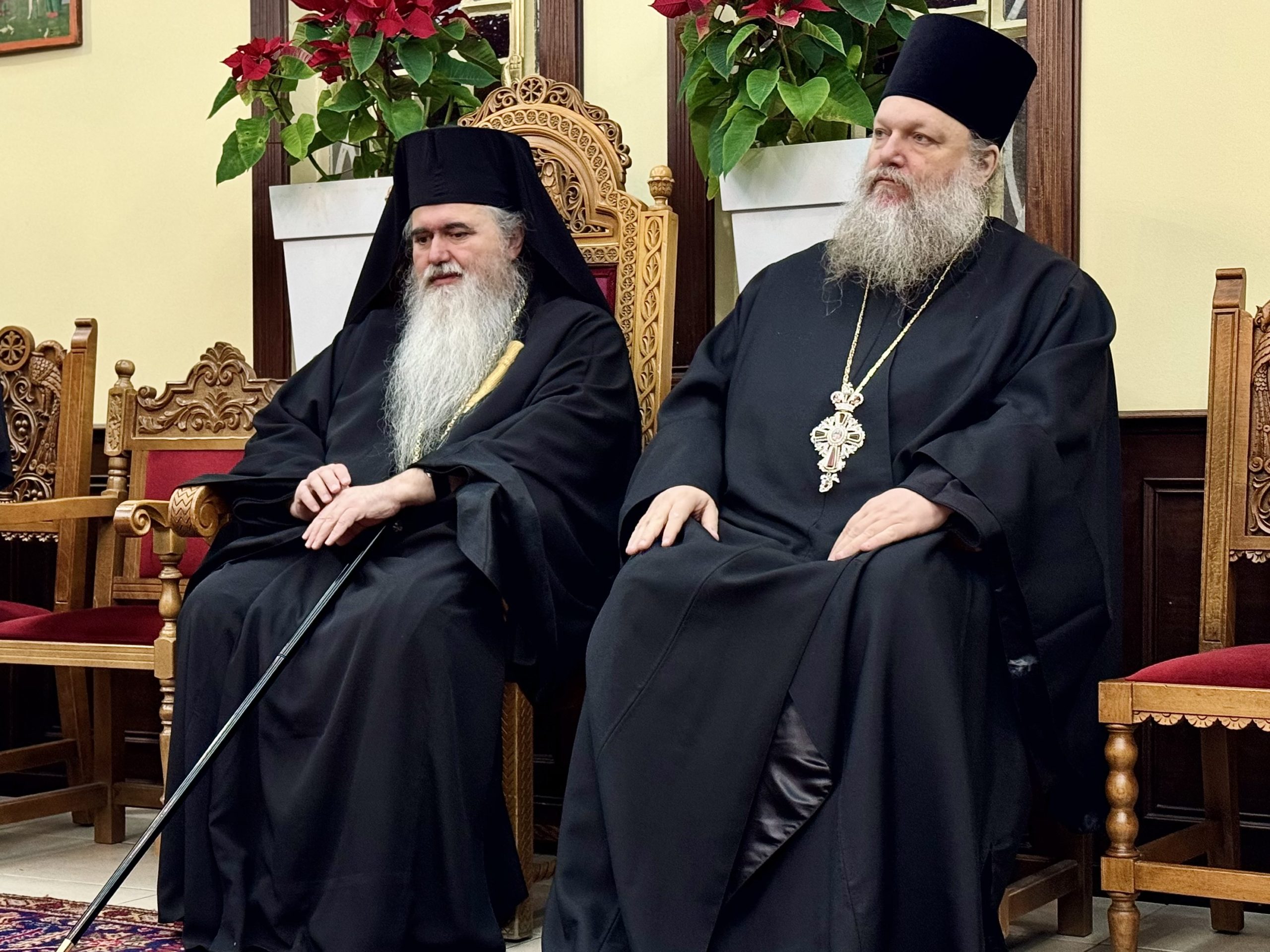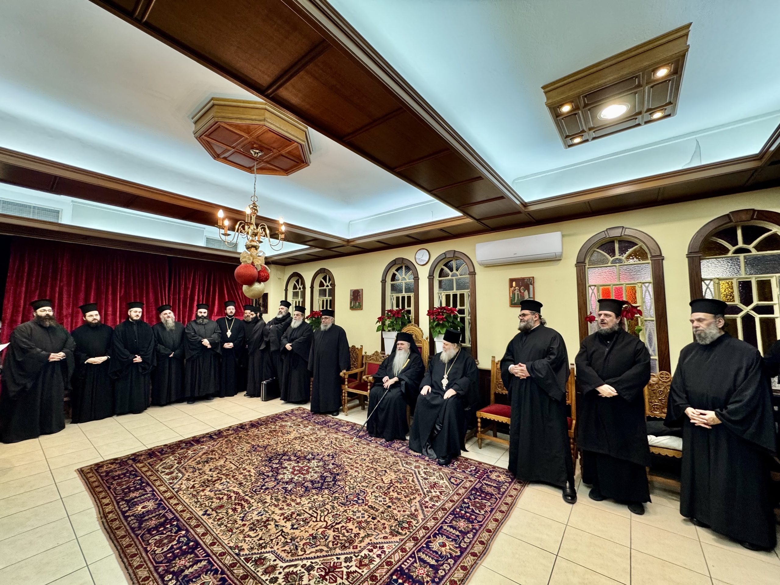 Μετά το πέρας του Εσπερινού, στην παρακείμενη αίθουσα του Ναού, άκουσε τα κάλαντα από τους ιερείς της Αρχιερατείας Καλαμαριάς.