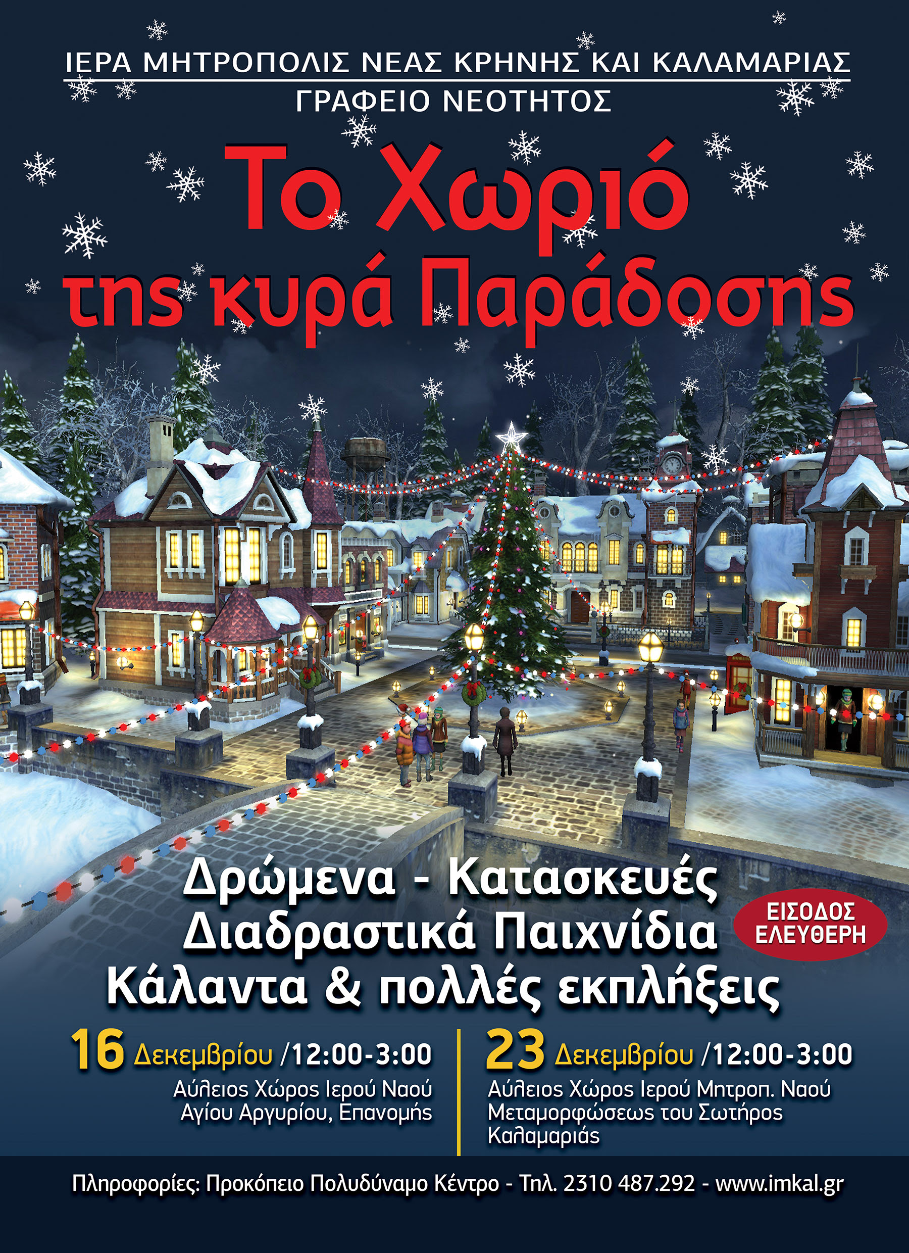 Το Χριστουγεννιάτικο χωριό της κυρά Παράδοσης, με τις ευλογίες του Σεβασμιωτάτου Μητροπολίτου Νέας Κρήνης και Καλαμαριάς, π. Ιουστίνου, ανοίγει ολόθερμα τις πύλες του για να υποδεχθεί μικρούς και μεγάλους, προσφέροντας στην Καλαμαριά, αλλά και στη μητροπολιτική περιφέρεια Θερμαϊκού, διαδραστικές δράσεις, δρώμενα, παιχνίδια και πολλές εκπλήξεις!