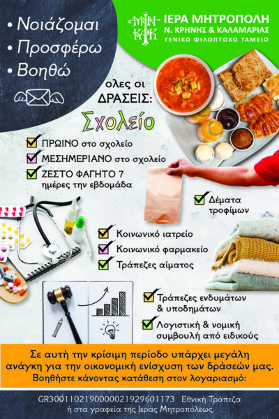 Το Γενικό Φιλόπτωχο Ταμείο της Ιεράς Μητρόπολης Νέας Κρήνης και Καλαμαριάς καλεί σε βοήθεια. Η τρέχουσα συγκυρία με την πανδημία του κορωνοϊού έχει επιδεινώσει ραγδαία την οικονομική κατάσταση του Γενικού Φιλοπτώχου Ταμείου της Ιεράς Μητροπόλεως θέτοντας σε κίνδυνο την λειτουργία των δράσεών του.