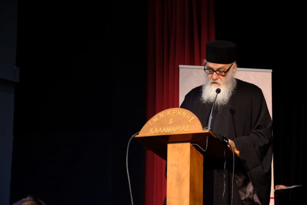 Στη συνέχεια το λόγο έλαβε ο οικείος ποιμενάρχης, Μητροπολίτης Νέας Κρήνης και Καλαμαριάς κ. Ιουστίνος ο οποίος καλωσόρισε όλους τους παρευρισκόμενους και στη συνέχεια σημείωσε: