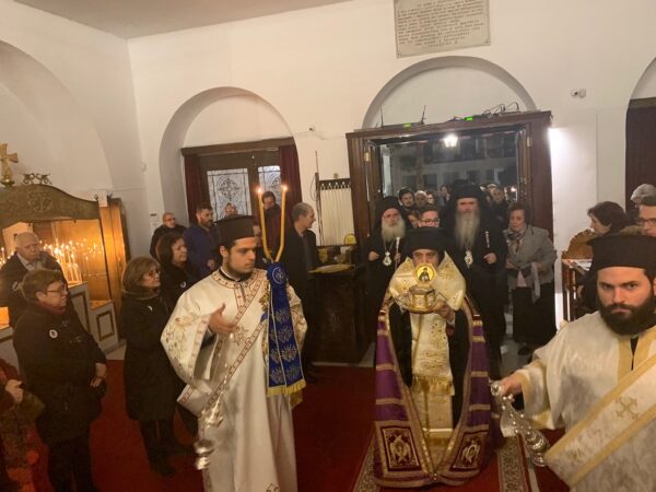 Στις Ιερές Ακολουθίες προέστη ο Σεβ. Μητροπολίτης Γέρων Δέρκων κ. Απόστολος, ο οποίος χοροστάστησε στην Ακολουθία του Μεγάλου Πανηγυρικού Εσπερινού και υποδέχθηκε προ των πυλών του πανηγυρίζοντος Ιερού ναού τεμάχιο του Ιερού Λειψάνου του Οσίου Ιωσήφ του Γεροντογιάννη από την Ιερά Μονή Καψά, το οποίο κόμισε και δώρισε στον Ιερό Ναό ο Σεβ. κ. Κύριλλος, προς διηνεκή ευλογία των πιστών. Επίσης στον Ιερό Ναό είχε μεταφερθεί προς αγιασμό των φιλαγίων πιστών η Τιμία Κάρα του Οσίου Δαβίδ του Γέροντος από την ομώνυμη Ιερά Μονή της Ιεράς Μητροπόλως Χαλκίδος.