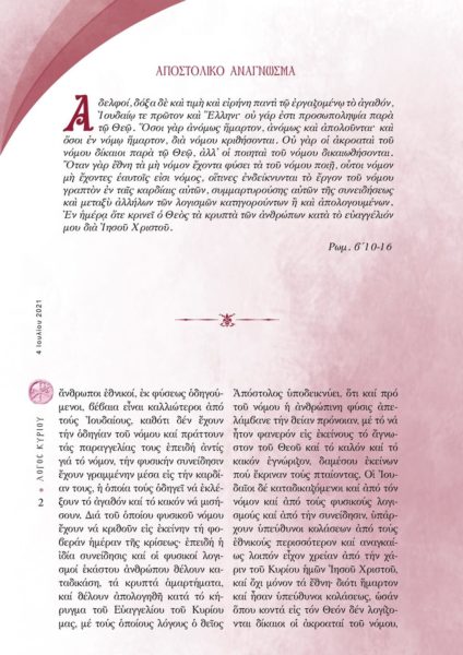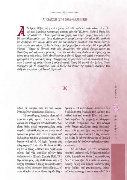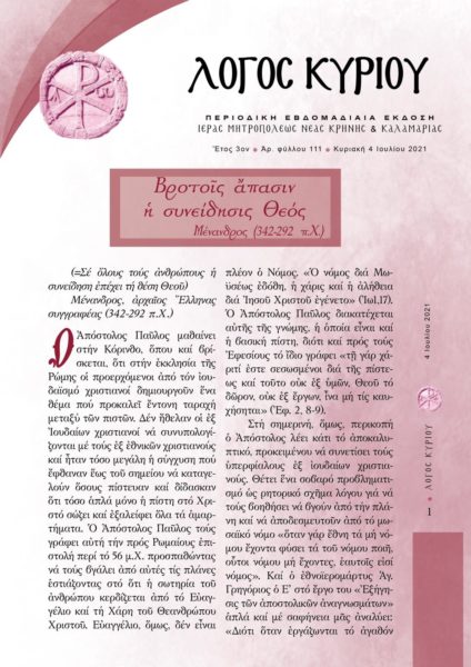 Εκδόθηκε ο “Λόγος Κυρίου”, η εβδομαδιαία έκδοση της Ιεράς Μητροπόλεως Νέας Κρήνης και Καλαμαριάς, για την Κυριακή 04/07/2021, με τίτλο ένα ρητό του Μενάνδρου, που λέει: «Βροτοῖς ἄπασιν ἡ συνείδησις Θεός», δηλαδή «Σε όλους τους ανθρώπους η συνείδηση επέχει τη θέση του Θεού».