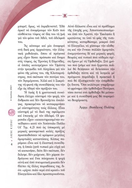 04/07/2021 04/07/2021 Εκδόθηκε ο “Λόγος Κυρίου”, η εβδομαδιαία έκδοση της Ιεράς Μητροπόλεως Νέας Κρήνης και Καλαμαριάς, για την Κυριακή 04/07/2021, με τίτλο ένα ρητό του Μενάνδρου, που λέει: «Βροτοῖς ἄπασιν ἡ συνείδησις Θεός», δηλαδή «Σε όλους τους ανθρώπους η συνείδηση επέχει τη θέση του Θεού». Γράφει ο Αρχιμανδρίτης Βασίλειος Πολίτης: