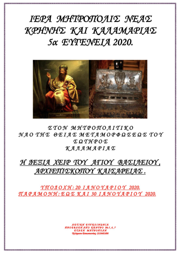 Η Ιερά Μητρόπολη Νέας Κρήνης και Καλαμαριάς έχει τη μεγάλη ευλογία να υποδεχτεί στον Ιερό Μητροπολιτικό Ναό Μεταμορφώσεως του Σωτήρος Καλαμαριάς το Ιερό Λείψανο του Αγίου Βασιλείου του Μεγάλου , με την ευκαιρία της εορτής του Αγίου Ευγενίου του Τραπεζουντίου.