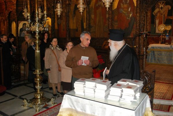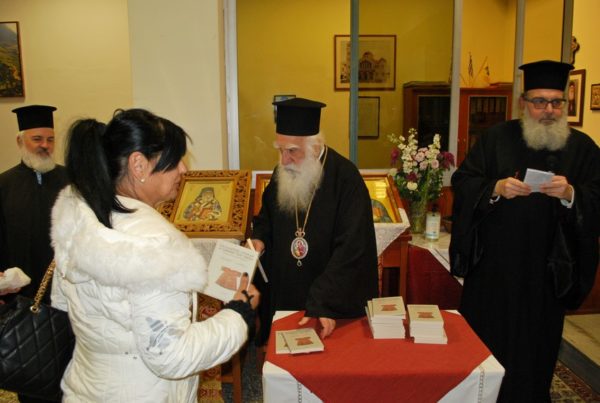 Εν συνεχεία ευχαρίστησε θερμά εξ ονόματος της Ιεράς Μητροπόλεως όλες τις κυρίες που διακονούν σε αυτό το σπουδαίο φιλανθρωπικό έργο και τους προσέφερε το βιβλίο «Η Ειρήνη του Θεού, Τα μυστήρια ως τρόπος θεραπείας» του μακαριστού Μητροπολίτου Διοκλείας κυρού Καλλίστου (Ware) από τις εκδόσεις «Πορφύρα».