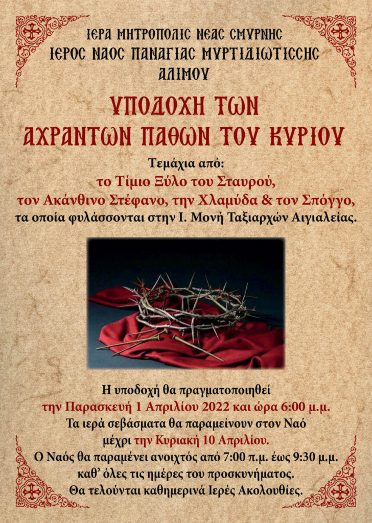 Με την ευλογία του Σεβασμιωτάτου Μητροπολίτη Νέας Σμύρνης κ. Συμεών και την ευγενή συγκατάθεση του Σεβασμιωτάτου Μητροπολίτη Καλαβρύτων και Αιγιαλείας κ. Ιερωνύμου, ο Ιερός Ναός Παναγίας Μυρτιδιωτίσσης Αλίμου, αποβλέποντας ποιμαντικώς στον αγιασμό, την πνευματική στερέωση και ενίσχυση των πιστών, και μάλιστα κατά την ψυχοσωτήριο περίοδο της Αγίας και Μεγάλης Τεσσαρακοστής, με τιμή, σεβασμό, αλλά και βαθιά κατάνυξη, θα υποδεχθεί τα Άγια και Άχραντα Πάθη του Κυρίου ημών Ιησού Χριστού, προερχόμενα εκ της παλαιφάτου Ιεράς Μονής Παμμεγίστων Ταξιαρχών Αιγιαλείας, την Παρασκευή 1 Απριλίου στις 18:00 στα προπύλαια του Ιερού Ναού.