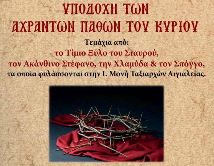 Τα ιερότατα κειμήλια του Πάθους του Κυρίου μας θα ευρίσκονται στον Ιερό Ναό Παναγίας Μυρτιδιωτίσσης Αλίμου από την Παρασκευή 1 Απριλίου έως την Κυριακή10 Απριλίου και ο Ναός θα παραμένει ανοικτός καθ’ όλη την διάρκεια του προσκυνήματος από 7.00 – 21.00.