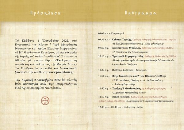 Το Σάββατο 1 Οκτωβρίου 2022, στο Πνευματικό της Κέντρο η Ιερά Μητρόπολη Ναυπάκτου και Αγίου Βλασίου θα πραγματοποιηθεί το Η΄ Θεολογικό Συνέδριο, με την ευκαιρία της εορτής του αγίου Ιεροθέου Α΄ Επισκόπου Αθηνών με γενικό θέμα: «Εκκλησιαστική παράδοση και πολιτισμός της Μικράς Ασίας» .Το Συνέδριο θα μεταδοθεί και διαδικτυακά ζωντανά στην διεύθυνση: https://parembasis.gr.