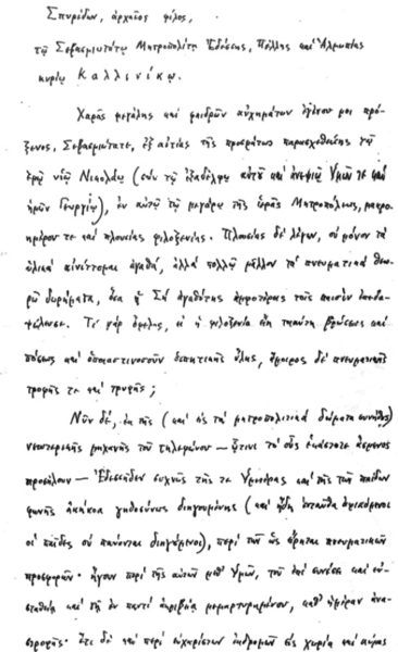 Χαρᾶς μεγάλης καί φαιδρῶν αὐχημάτων ἐγένου μοι πρόξενος, Σεβασμιώτατε, ἐξ αἰτίας τῆς προσφάτως παρασχεθείσης τῷ ἐμῷ υἱῷ Νικολάῳ ( σύν τῷ ἑξαδέλφῳ αὐτοῦ καί ἀνιψιῷ Ὑμῶν τε καί ἡμῶν Γεωργίῳ) ἐν αὐτῷ τῷ μεγάρῳ τῆς ἱερᾶς Μητροπόλεως, μακροημέρου τε καί πλουσίας φιλοξενίας. Πλουσίας δέ λέγων, οὐ μόνον τά ὑλικά αἰνίττομαι ἀγαθά, ἀλλά πολλῷ μᾶλλον τά πνευματικά θεωρῶ δωρήματα, ὅσα ἡ Σή ἀγαθότης ἀμφοτέροις τοῖς παισίν ἐπεδαψέλευσε. Τί γάρ ὄφελος, εἰ ἡ φιλοξενία εἴη τοιαύτης βρώσεως καί πόσεως καί ὁποιαστινοσοῦν ὁσπητικῆς ὕλης, ἄμοιρος δέ πνευματικῆς τροφῆς τε καί τρυφῆς;