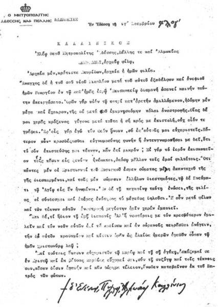 Τῆς Ὑμετέρας Σεβασμιότητος μετ’ εὐλαβείας ἀσπαζόμενος τήν δεξιάν, σύν τῇ ἐμῇ συζύγῳ Εὐαγγελίᾳ καί τῇ θυγατρί Ἐριφύλῃ, τάς θεοπειθεῖς Ὑμῶν εὐχάς ἀπεκδέχομαι