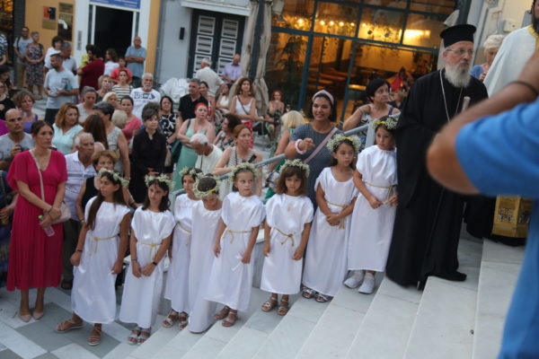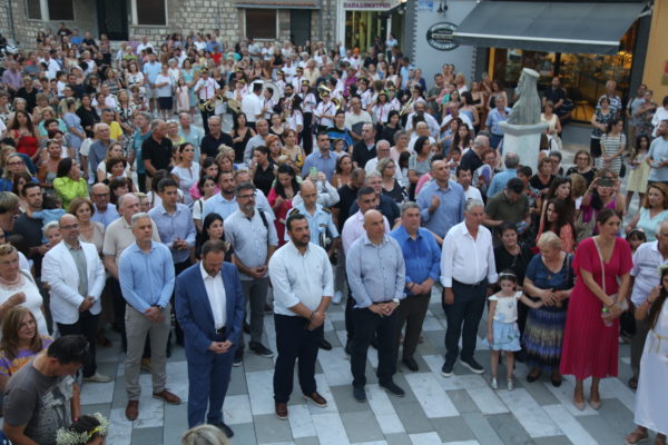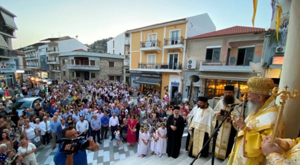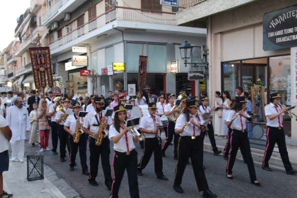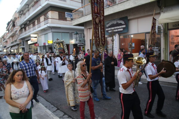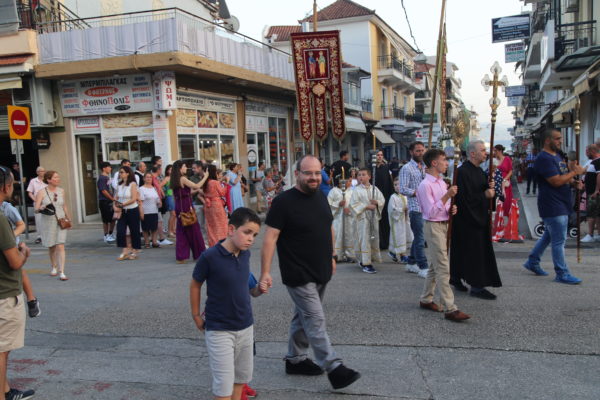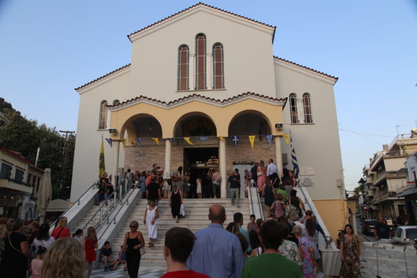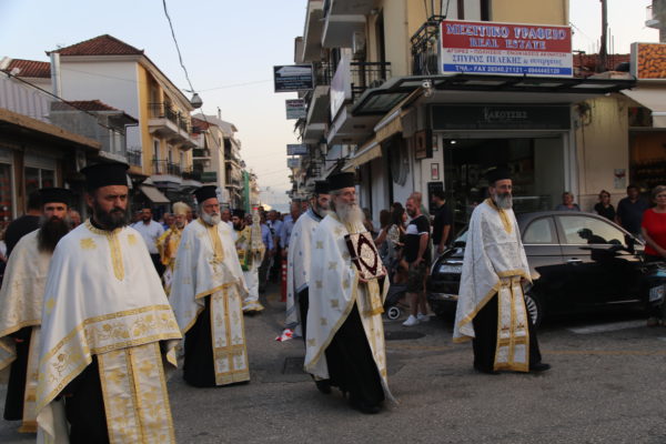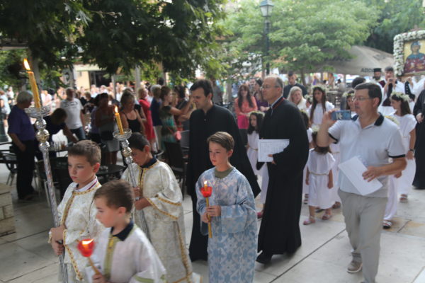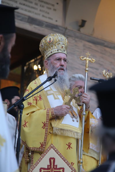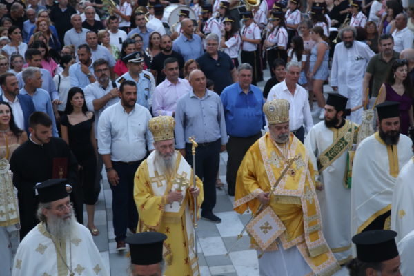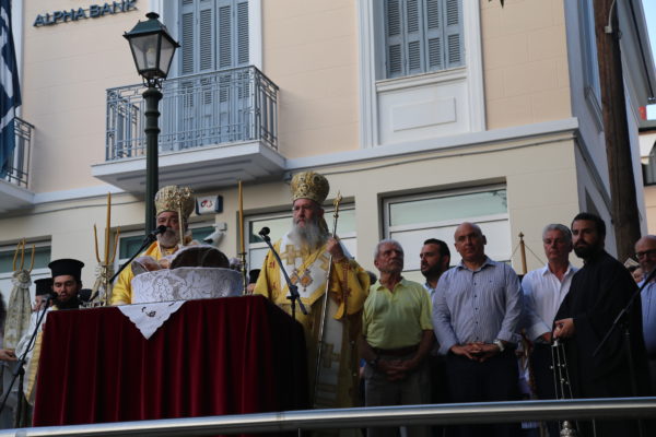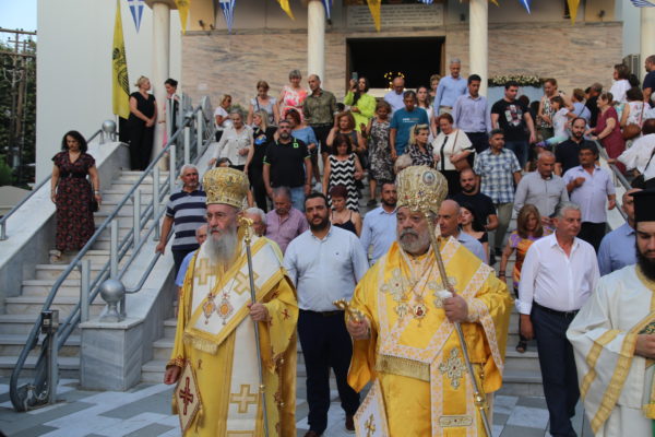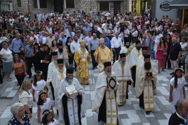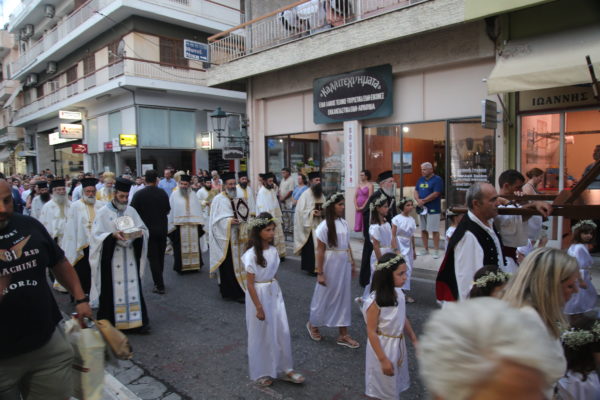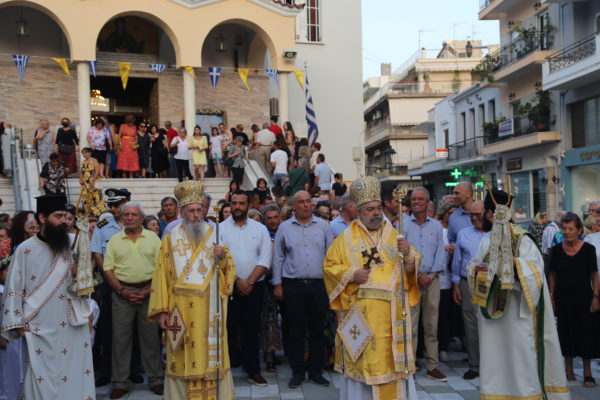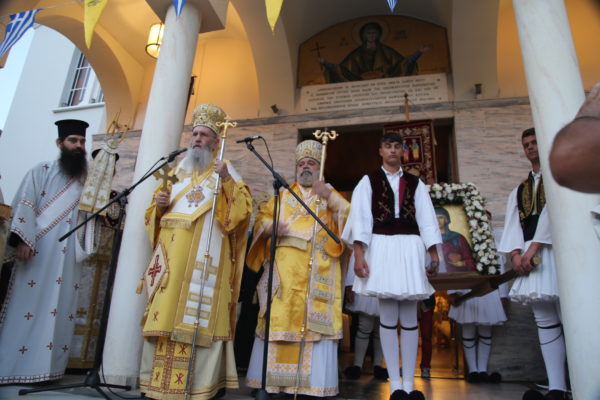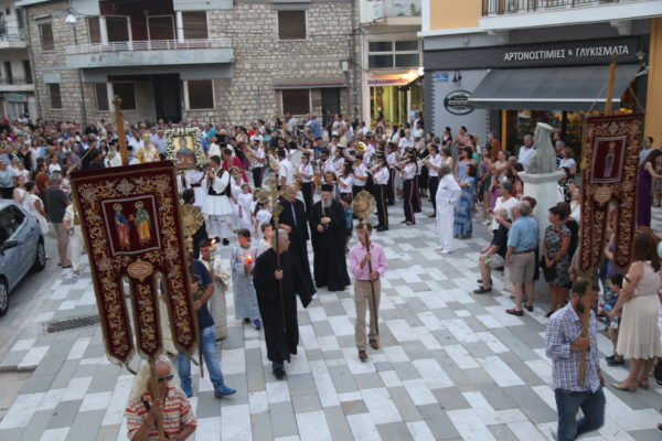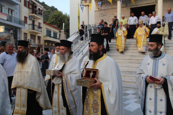 Στην συνέχεια η ιερά πομπή πέρασε από τους κεντρικούς δρόμους της πόλεως και κατέληξε στα προπύλαια του Ιερού Ναού όπου έγινε η απόλυση του Εσπερινού.